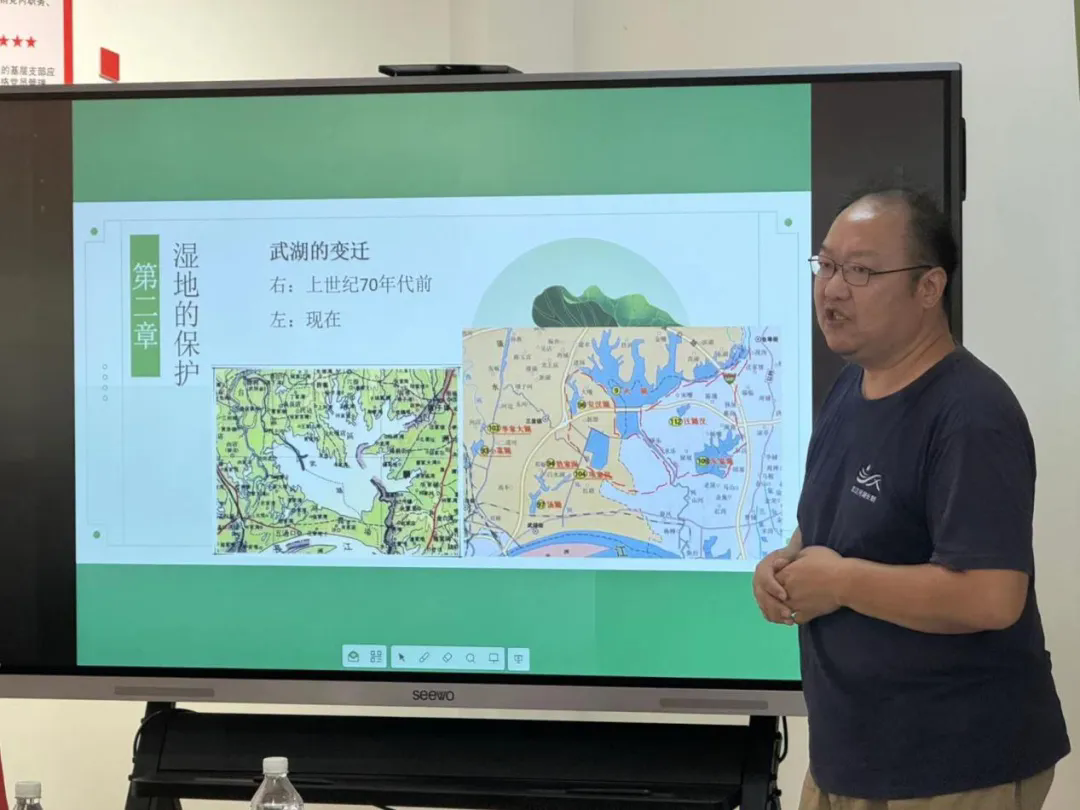 武汉市黄陂区湿地局副局长马立强分享了他们的日常工作。他谈到,湿地保护工作涵盖多个方面,包括监管监测、环保自查、宣传教育、联合执法以及野生救助等。通过马副局长的分享,师生们更加深入地了解了湿地保护工作的复杂性和艰巨性。