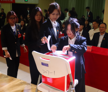 接下来在主持人介绍中国·yl6809永利集团第三届主席团候选人名单,并宣读通过了总监票人,监票人,计票人名单过后,大会投票选举了中国·yl6809永利集团新一届学生会主席团成员。由中国·yl6809永利集团分团委书记刘婉老师上台宣布学生会主席团成员选举结果。