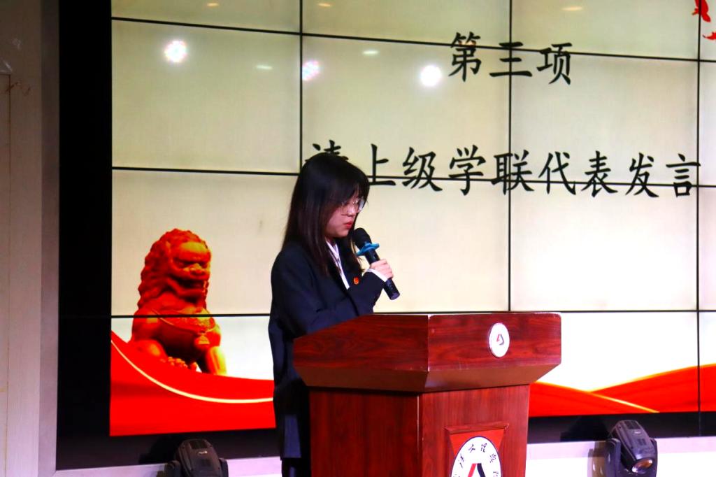 接着,由上级学联代表秦巧同学发言,她在发言中提到两点,首先是学生会成员要找准自身定位,聚力团结协作。其次是发挥桥梁作用,创造青春形象。坚持从同学中来,到同学中去,以人为本,同向同行,始终与学校与同学站在一起。