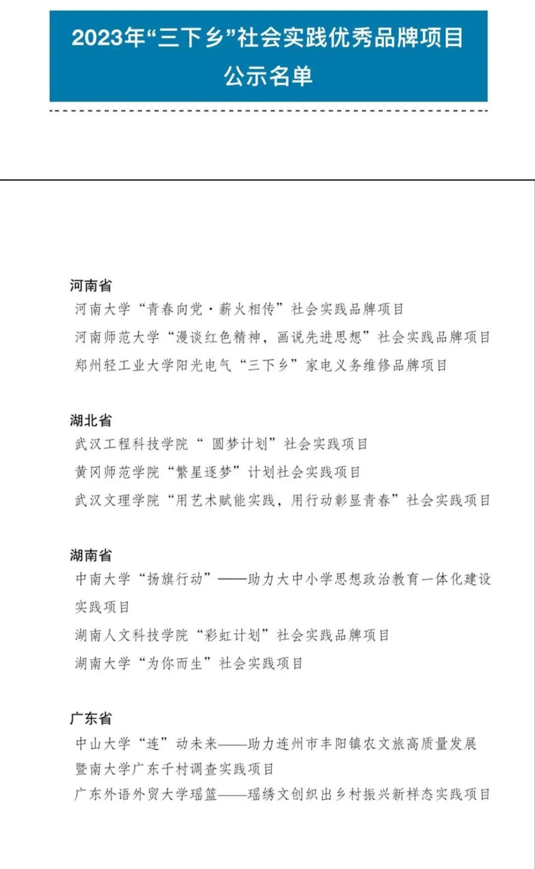 2023年”三下乡“活动已公布了社会实践优秀品牌项目名单,其中我校“文理小蜜蜂”志愿队以名为“用艺术赋能实践,用行动彰显青春”的项目荣获优秀品牌项目奖。