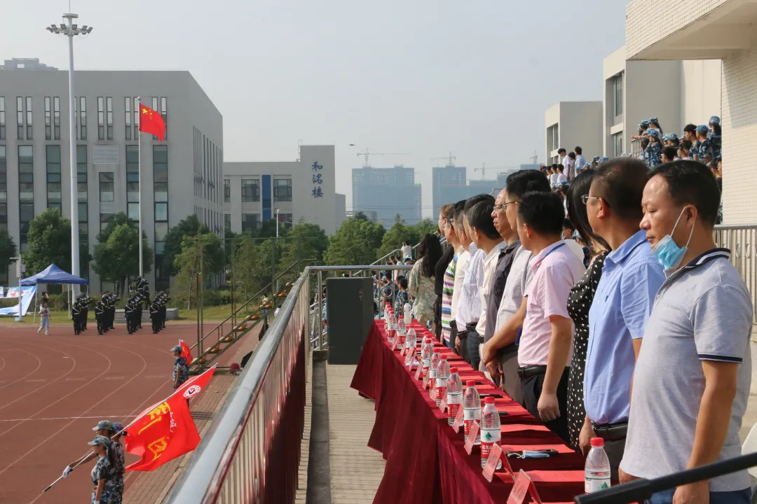 阅兵式在庄严的升旗仪式中拉开帷幕,全体师生奏唱国歌,向国旗行注目礼。