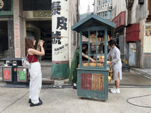 广告1班的郭曼琪感慨:“课本中‘场景营销’的概念在这里具象化了——香港街的南洋骑楼不仅能拍民国广告,稍加光影调整又可呈现赛博朋克风,这种空间叙事的多重可能性令人震撼。” 学生们化身“微型剧组”,在老师指导下实操拍摄。有人在九龙寨城反复调试运镜角度,试图用压迫感的巷道构图传递悬疑氛围;有人为民国风珠宝广告手工改制道具,将现代饰品融入老上海橱窗陈列;也有人通过观摩《风雨潮》剧组的现场调度,学习如何使用灯光,收音,无人机等设备。当学生们为了一盏油灯的布光角度争论半小时时,理论教材中的‘视觉符号建构’真正落地了。”