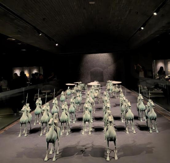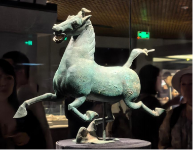 聚焦于甘肃省博物馆特色IP形象来源,馆内的镇馆之宝铜奔马,是中国古代雕塑艺术的杰出代表。铜奔马造型矫健精美,奔马三足腾空,一足超掠飞鸟,着力点集中于超越飞鸟的一足之上,平衡稳妥,显示出一种勇往直前的豪情壮志,是中华民族豁达向前伟大气质的象征。