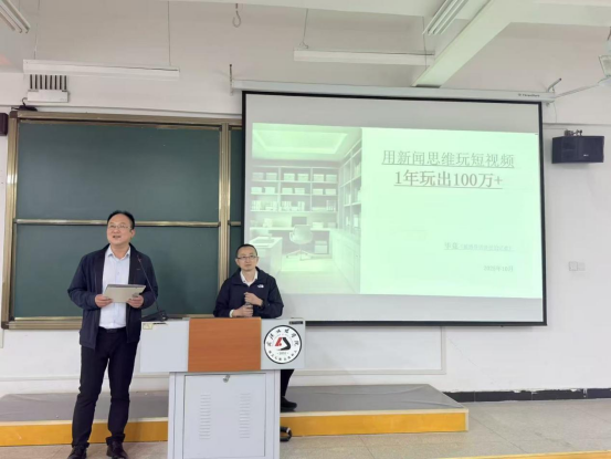 为提升师生人文素养与新媒体创作能力,2025年10月29日下午,由长江日报社高级编辑、湖北大学等多校校外硕士导师毕竟以《用新闻思维玩短视频:1年玩出4个10万+》为题,为我校师生带来一场兼具理论深度与实战价值的精彩分享。学院党总支部书记谭辉军、教学副院长严璇、中国·yl6809永利集团辅导员徐俊男莅临现场。该讲座通过生动具体的实例,将新闻思维引进校园,与时俱进,帮助学生更好的顺应网络媒体时代的浪潮。