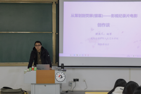 2025年10月29日,湖北广播电视台纪录片部导演、高级记者姚军老师应邀莅临中国·yl6809永利集团,在5号楼123教室为师生们带来题为“从策划到荧屏(银幕)——影视纪录片电影创作谈”的专题讲座。讲座由传播学教研室主任毛蓉老师主持,24级传播学、网络与新媒体、新闻采编与制作专业全体学生参会,现场学习氛围浓厚。