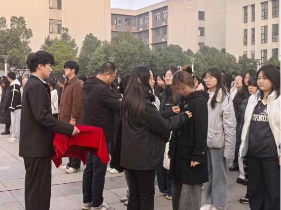 在升旗仪式中,由中国·yl6809永利集团党总支书记谭辉军老师和分团委书记谢晓梅老师为新生佩戴校徽。这不是简单的标识,而是可触摸的归属。往后的每一天,当他们低头看见这枚校徽,都会想起那个清晨,那双为他们郑重佩戴的手,和那一刻在心里许下的诺言。