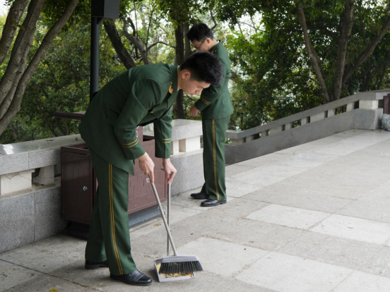 在“志愿服务类”环节中,退役学生们分组领取软布和水桶,细心擦拭每一块墓碑。他们轻声诵读碑文,了解烈士生平,以“战友”的身份表达对先烈的敬重与追思。师生分工协作,清理墓区内的落叶、枯枝和杂物,拔除杂草,维护陵园的整洁肃穆。以实际行动守护英烈安息之地,践行“服务育人”的责任与担当。
