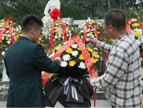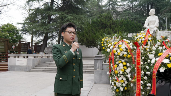 当天,全体人员乘坐大巴抵达陵园,整队入场。活动在庄严肃穆的氛围中拉开帷幕,由退役军人辅导员张成主持。张老师讲到“向警予烈士是中国妇女运动的杰出领袖、中国共产党早期优秀党员,她用青春和生命诠释了信仰与忠诚。作为曾经的军人、如今的学子,我们更应铭记历史、传承精神。”张老师铿锵有力的开场词,点燃了在场每一个人的敬意。全体肃立,奏唱《义勇军进行曲》,激昂的旋律在陵园上空回荡。两名退役学生代表礼兵抬花篮齐步走向纪念碑,教师代表谭辉军与退役学生代表贾孝龙共同整理挽联。随后,全体人员伴随《献花曲》默哀一分钟,向英烈致以最深切的哀思。