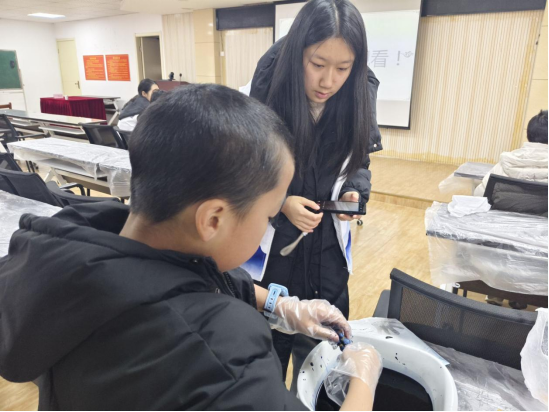 教学环节从简易扎法入手,志愿者们分组围在孩子们身边,手把手耐心指导。大家先将白布平铺,或捏成紧实的小疙瘩,或折成规整的三角形,或团成圆滚滚的小球,再用皮筋层层缠绕固定。孩子们彻底释放奇思妙想,有的用多根皮筋在布面上勾勒出复杂纹路,有的尝试创新扎法打造专属造型,活动室里满是清脆的讨论声、欢快的笑声与橡皮筋拉扯的细微声响,热闹又温馨。