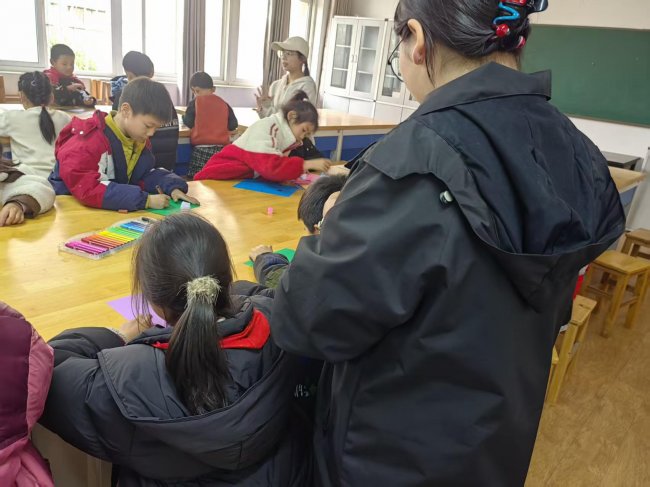 志愿者们早早地来到教室,精心布置场地,将一张张长条形的白色卡纸、彩色的卡纸、五彩的马克笔整齐地摆放在每个孩子的桌前。他们弯下腰,耐心地指导着每一个孩子:“把纸条卷一卷,再粘一粘,就能变出小花的茎啦!”面对孩子们的疑问,志愿者们总是不厌其烦地一遍遍示范,直到孩子们成功完成第一步。