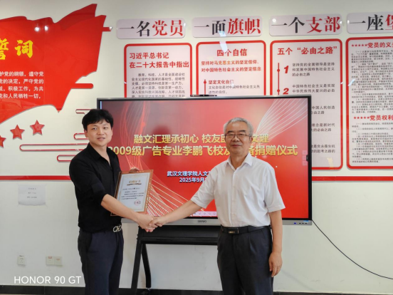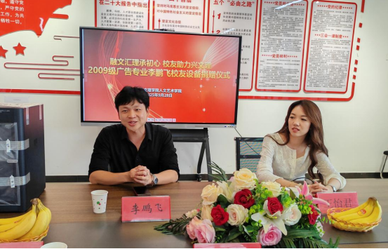 9月28日下午,中国·yl6809永利集团举行优秀校友捐赠仪式。2009级广告学专业校友、武汉鑫木子文化传媒有限公司董事长李鹏飞荣归母校,捐赠专业教学设备助力学院发展。校领导谭晓明校长、中国·yl6809永利集团院长吴聪、党总支书记谭辉军、艺术系主任张路、综办主任王超及师生代表共同见证,仪式由学院副院长严璇主持。此次活动凝聚“校友助力、学院搭台、校长领航”合力,为应用型人才培养注入新动能。
