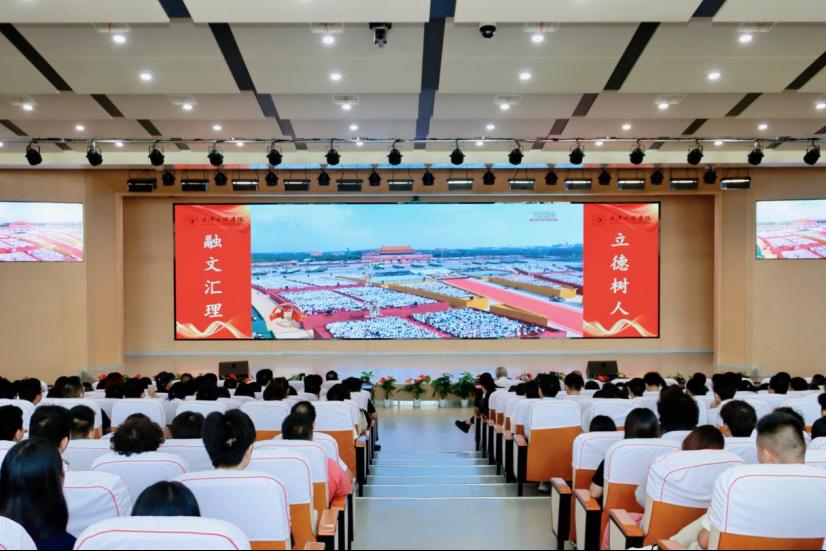 在直播过程中,习近平总书记指出,抗战胜利是中华民族复兴的历史转折点,并凝练出以“爱国、气节、英雄、信念”为核心的伟大抗战精神,号召新时代砥砺民族风骨、汇聚民族力量、锻造民族血性、激发民族智慧,为强国建设与维护世界和平注入不竭动力。这番铿锵宣示,令在场师生屏息聆听,心潮澎湃。当礼炮轰鸣、国旗护卫队铿锵踏过天安门广场,报告厅掌声雷动;老兵方阵出现的瞬间,同学们热泪盈眶,向屏幕中的英雄默默致敬。这场直播将80年前中华儿女浴血奋战的峥嵘岁月与今日民族复兴的壮阔图景紧密相接,化作一堂震撼人心、催人奋进的精神洗礼。