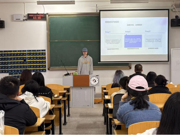 在分享环节,两位成功考入本校的学姐--姚柯金与魏静蕾结合亲身经历,分享了系统而实用的备考经验。她们从院校选择、复习规划到心态调整进行了细致梳理,强调“明确目标、拒绝跟风”是成功的第一步。在专业课方面,学姐提出要“地毯式背诵、定期复盘”,注重效率而非速度;英语备考则需把握细节,善用学习工具积累词汇与模板。此外,她们还鼓励学弟学妹保持节奏、劳逸结合,并强调“坚持是通往成功的唯一捷径”。真诚而贴近实际的分享,为在场同学注入了信心与动力,引来阵阵掌声。