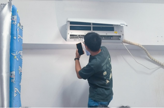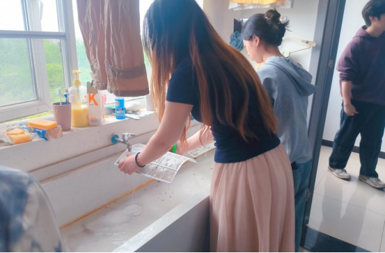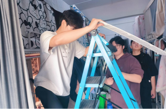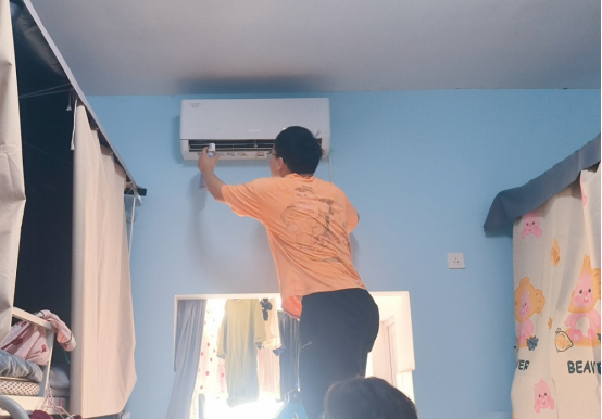 在实操环节,刘老师现场示范了空调滤网拆装、清洗剂使用等专业操作流程。各小组随即展开行动,同学们分工协作、配合默契:有的负责扶稳梯子保障安全,有的专注清洗滤网,有的使用专业清洗剂喷洗内部部件,有的准备清水进行二次冲洗。考虑到宿舍环境卫生,部分同学还主动帮助整理物品、清理地面,确保服务过程不影响同学们的正常生活。