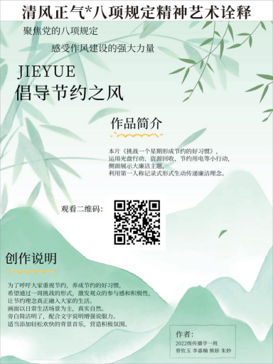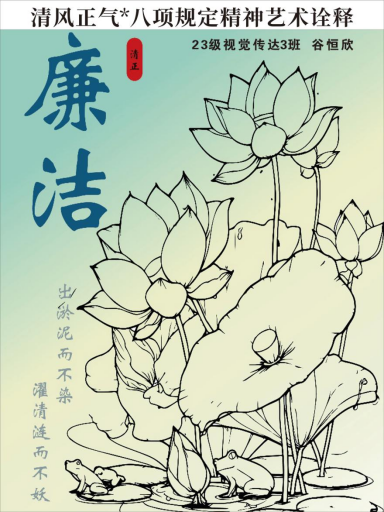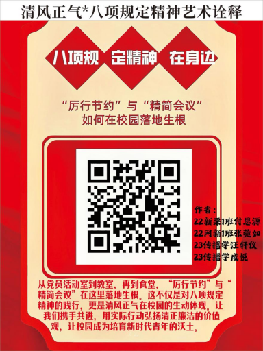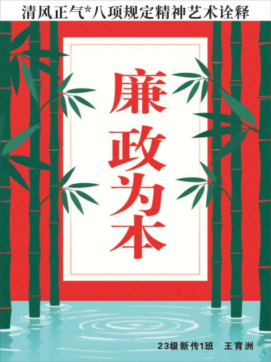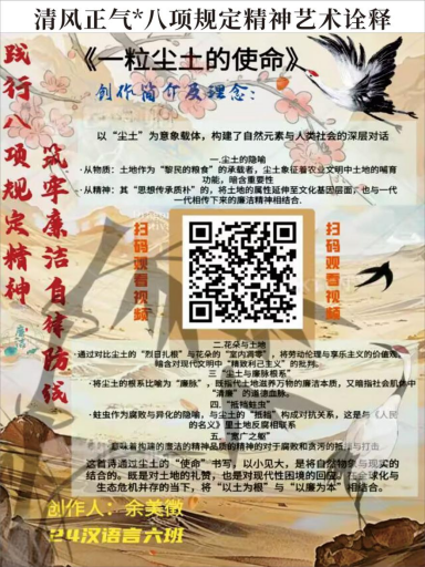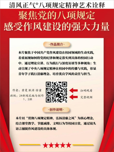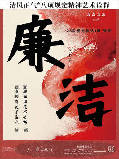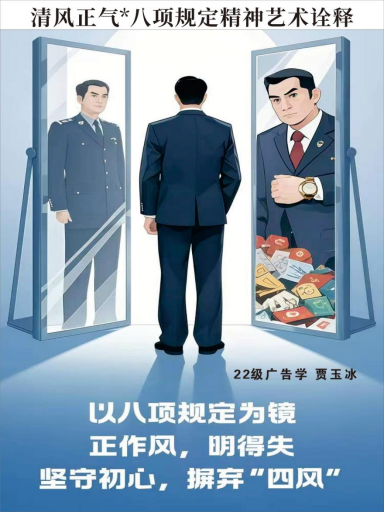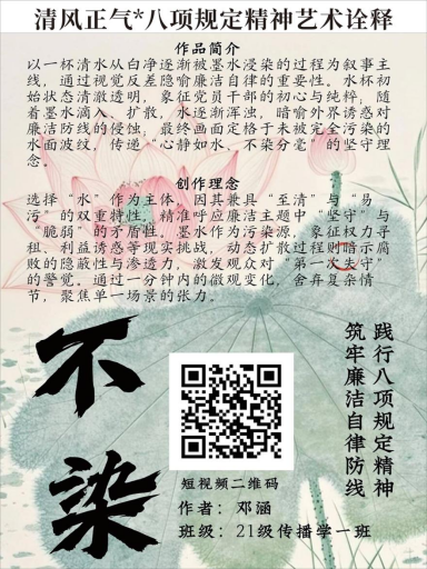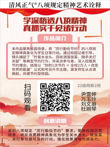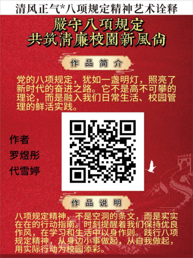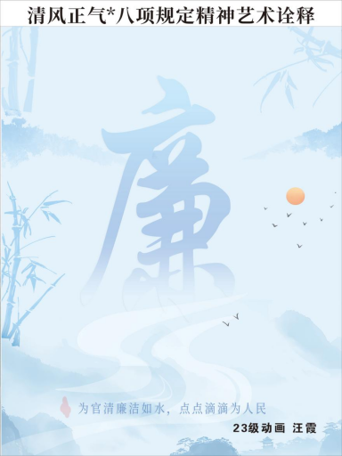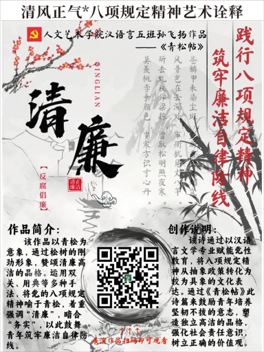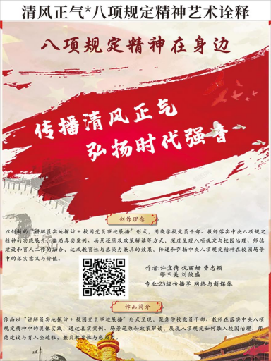 为深入贯彻中央八项规定精神学习教育,强化学生党员纪律意识和作风建设;结合专业特色,创新党性教育形式,推动理论学习与实践创作深度融合;强化中国·yl6809永利集团“艺心向党1+1+N”党建品牌,发挥人文艺术学科优势,以文化人、以艺育人,弘扬清正廉洁的价值观。通过“专业+廉政”的创意实践,将八项规定精神从抽象政策转化为具象的文化表达,提升学生专业能力,强化党性修养,实现党建与育人的双向赋能。