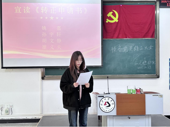 大会在庄严的国歌声中拉开序幕。按照流程,4名预备党员依次宣读《转正申请书》,围绕思想成长、学业工作、不足改进等方面,详细汇报了预备期内的收获,同时坦诚剖析了自身理论学习不够系统、实践经验有待积累等问题,并明确了后续提升方向。随后,支部组织委员代表支委会宣读考察报告,结合一年来的培养与观察,肯定了4名同志在政治觉悟提升、服务群众意识增强等方面的进步,同时客观指出其理论联系实际不够紧密、应对复杂问题能力不足等短板,支委会一致认为4名同志已基本具备正式党员条件,建议大会讨论其按期转正。