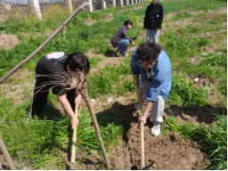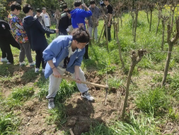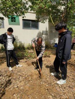 活动过程中,同学们兴致勃勃,干劲十足。女同学主要负责拔除影响树苗生长的杂草,而男同学则在老师们的指导下默契配合铲土植树。确定好树苗位置后,大家或三人或五人一组,拿起铁锨,挥舞镐头,师生一起挖坑、刨土、埋树,配合默契。植树过程中,老师们就如何正确使用工具、保证树苗的成活率进行了指导,现场气氛热烈,大家脸上洋溢着微笑,尽情享受着劳动带来的快乐和喜悦。