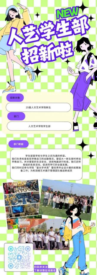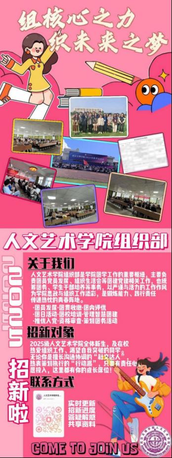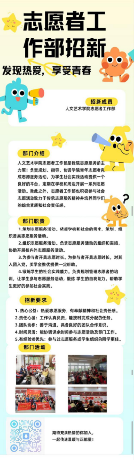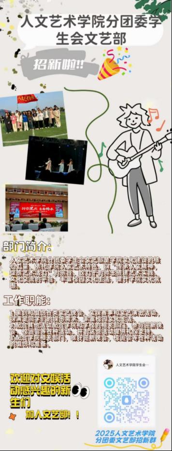 我们期待招纳对文艺表演有浓厚兴趣,具有一定主持经验,性格热情开朗、耐心细致的同学加入。希望你充满活力,乐于展示自我,并能积极融入团队协作,共同呈现精彩的校园文艺生活!