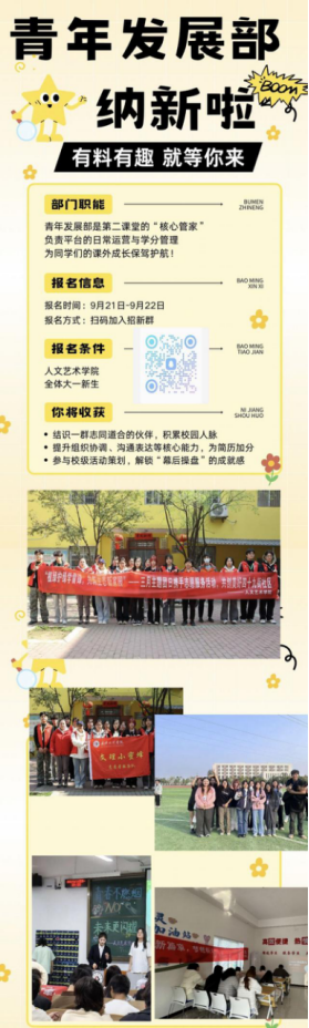 青年发展部是第二课堂的“核心管家”,负责平台的日常运营与学分管理,为同学们的课外成长保驾护航!主要工作包括:第二课堂管理:活动审核、发布、签到及数据维护,确保平台高效运行;学分统计:精准记录每位同学的实践学分,助力综合素质评定;活动支持:协助各类校园活动落地,见证第二课堂的精彩。