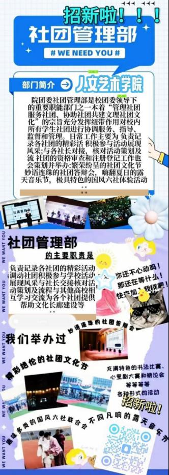 社团管理部主要负责记录各社团的精彩活动,通过图文、影像等方式展现社团活力;积极调动各社团参与学校大型活动,助力社团展示自身特色与风采;同时,与各社团负责人保持顺畅沟通,共同核对活动策划及流程,为社团运营提供必要支持与协助,并参与校园文化长廊的建设与管理。