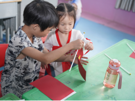 实践环节以“手绘国旗”为主题,老师引导孩子们将对国旗的理解融入创作。孩子们拿起画笔,在白色画纸上认真勾勒、涂色:有的仔细描摹五角星的角度,确保每一笔都规范整齐;有的在国旗旁画上天安门、和平鸽等元素,用稚嫩的笔触表达对祖国的祝福;还有的特意选用鲜艳的红、黄颜料,力求让国旗的色彩如心中所见般鲜亮。老师从比例调整到色彩搭配给予耐心指导,帮助孩子们在动手过程中深化对国旗意义的认知。
