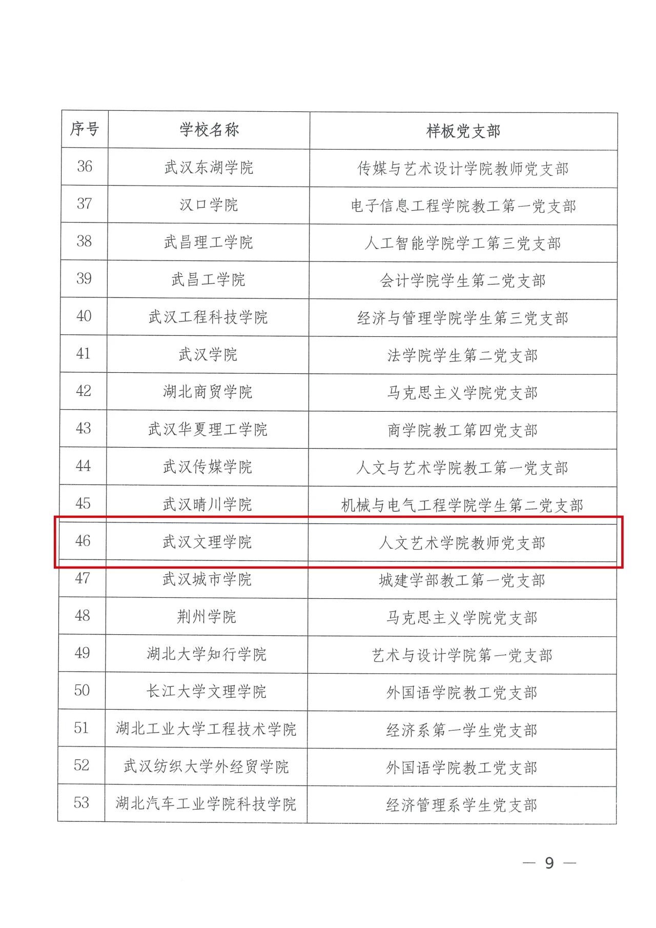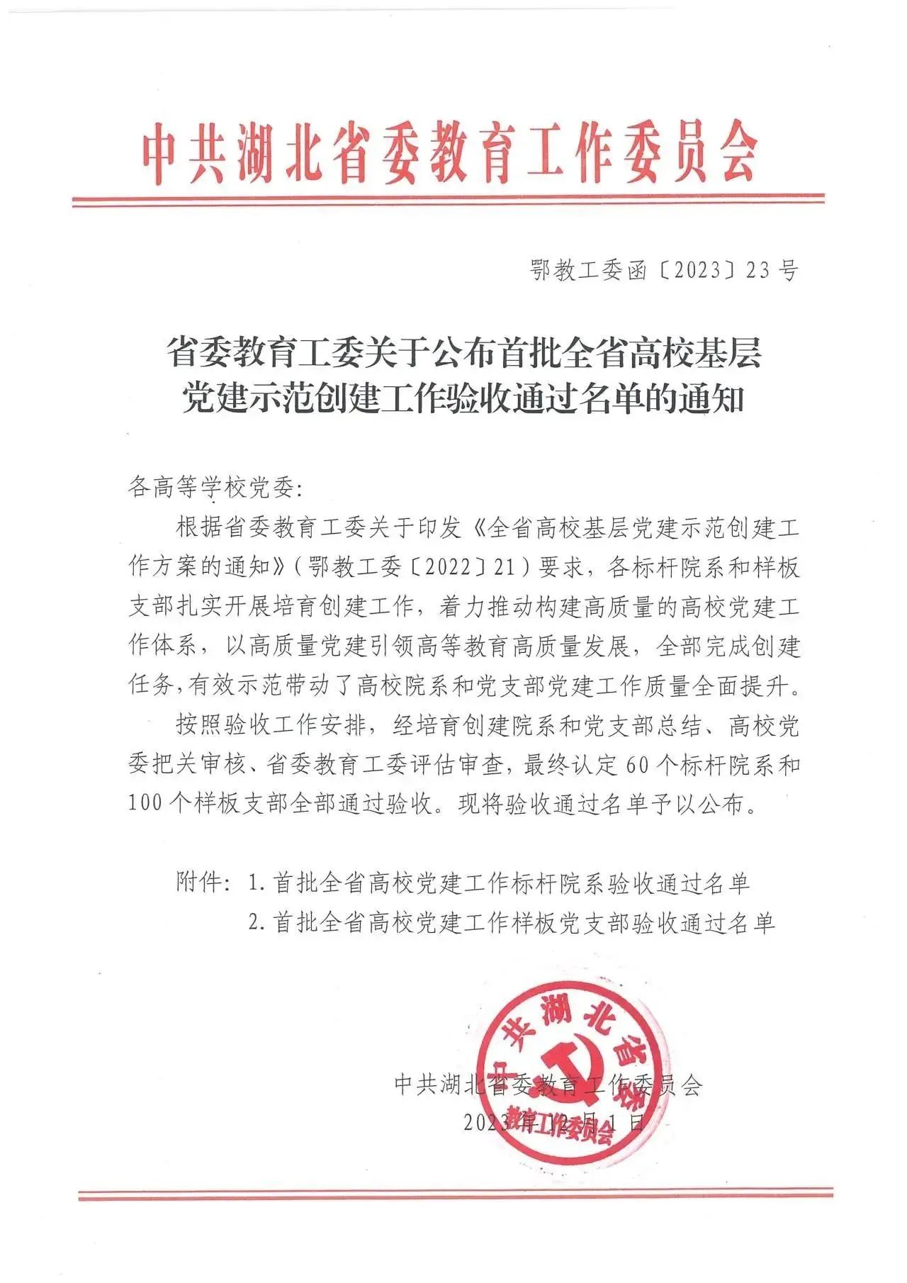 2022年9月,中共湖北省委教育工委印发《关于公布全省高校党建工作标杆院系、样板党支部培育创建单位名单的通知》,确定了60个全省高校党建工作标杆院系、100个全省高校党建工作样板党支部培育创建单位。中国·yl6809永利集团教师党支部入选“全省高校党建工作样板党支部”培育创建单位。