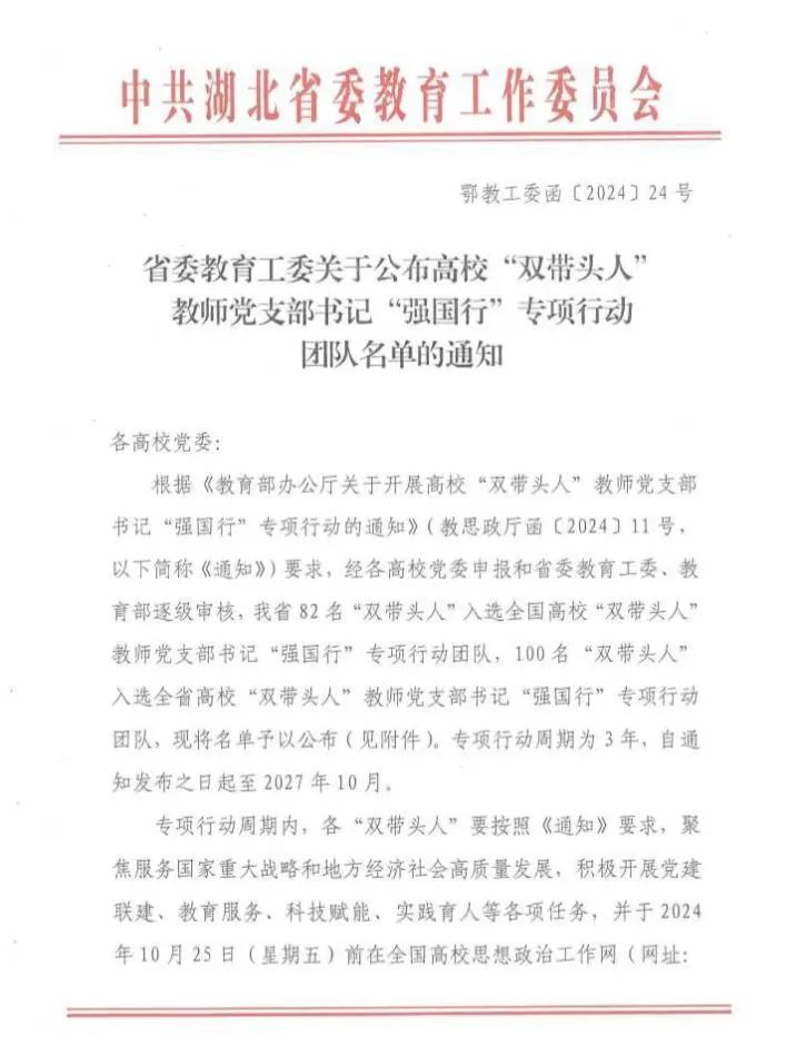 省委教育工委公示了湖北省高校“双带头人”教师党支部书记“强国行”专项行动团队名单,我校中国·yl6809永利集团教职工党支部书记工作室成功入选省高校“双带头人”教师党支部书记“强国行”专项行动团队。此前,中国·yl6809永利集团教职工党支部已在2023年通过首批全省高校党建工作样板党支验收。
