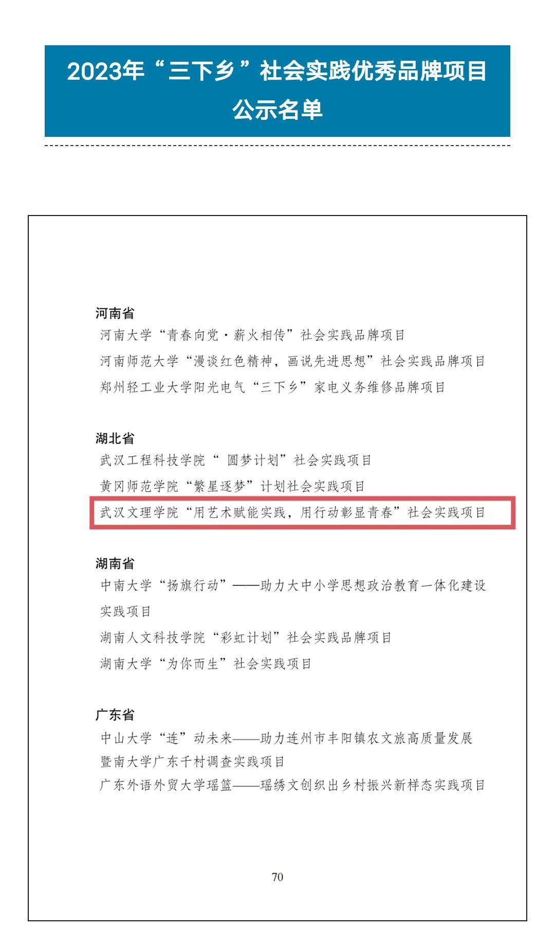 经过长期的努力,夏日播下的种子终于在秋日发芽,该团队特色项目——“用艺术赋能实践,用行动彰显青春”社会实践项目在2023年全国大中专学生志愿者暑期文化科技卫生“三下乡”社会实践活动总结通报结果中被评选为2023年“三下乡”社会实践优秀品牌项目。