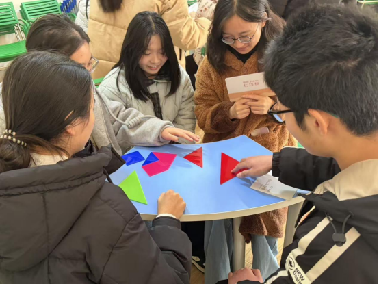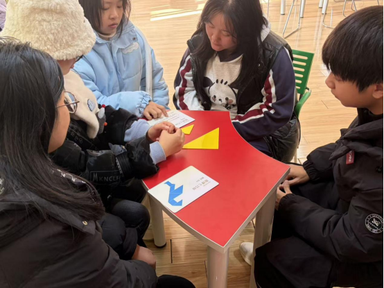 活动开始前,通过握手的热身活动进行过度,同学们在欢乐的小游戏里逐渐进入状态,整个教室洋溢着开心的笑声。活动创新采用任务协作模式,将班级同学分为不同的组。,其中1至4组需在座位上协作完成七巧板拼图任务,过程中不得随意离开座位;第5组则担任“资源协调者”,负责收集各组需求、统筹调配七巧板资源。在简单讲解游戏规则以后,同学们眼中闪烁着跃跃欲试的光芒。